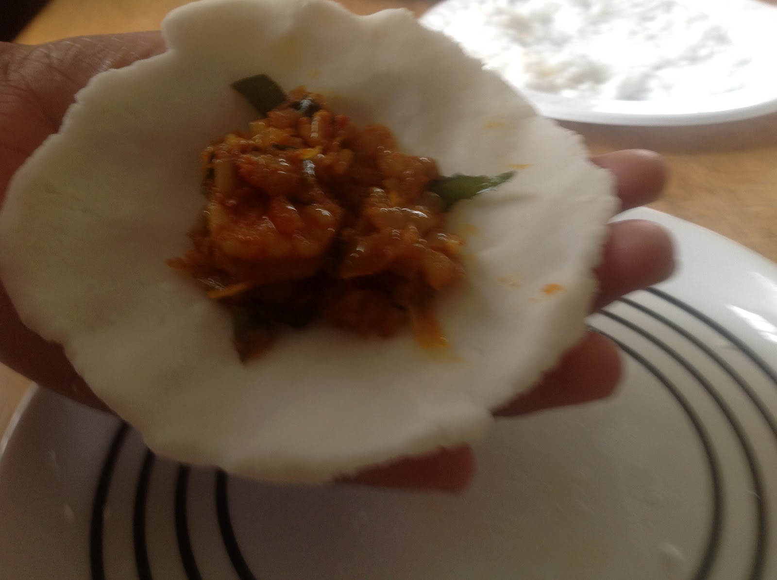 Ingredients: 3 cups rice flour 250 gm prawns/ chemmeen 1 tbsp chilli powder 1 tsp coriander powder 1 tsp turmeric powder 3 onions, finely chopped 3 green chillies, finely chopped 4 garlic cloves, chopped 1 small piece gi...