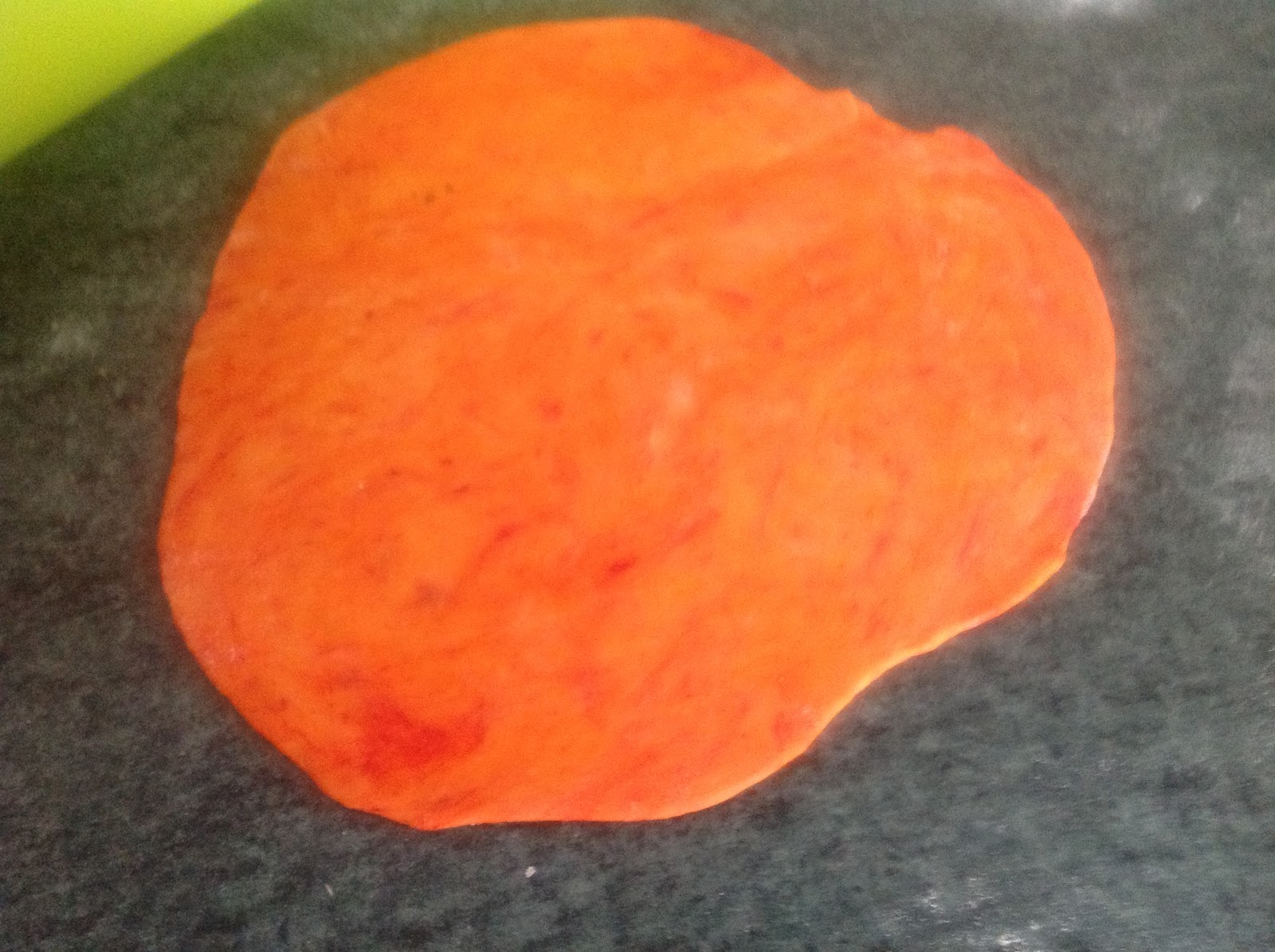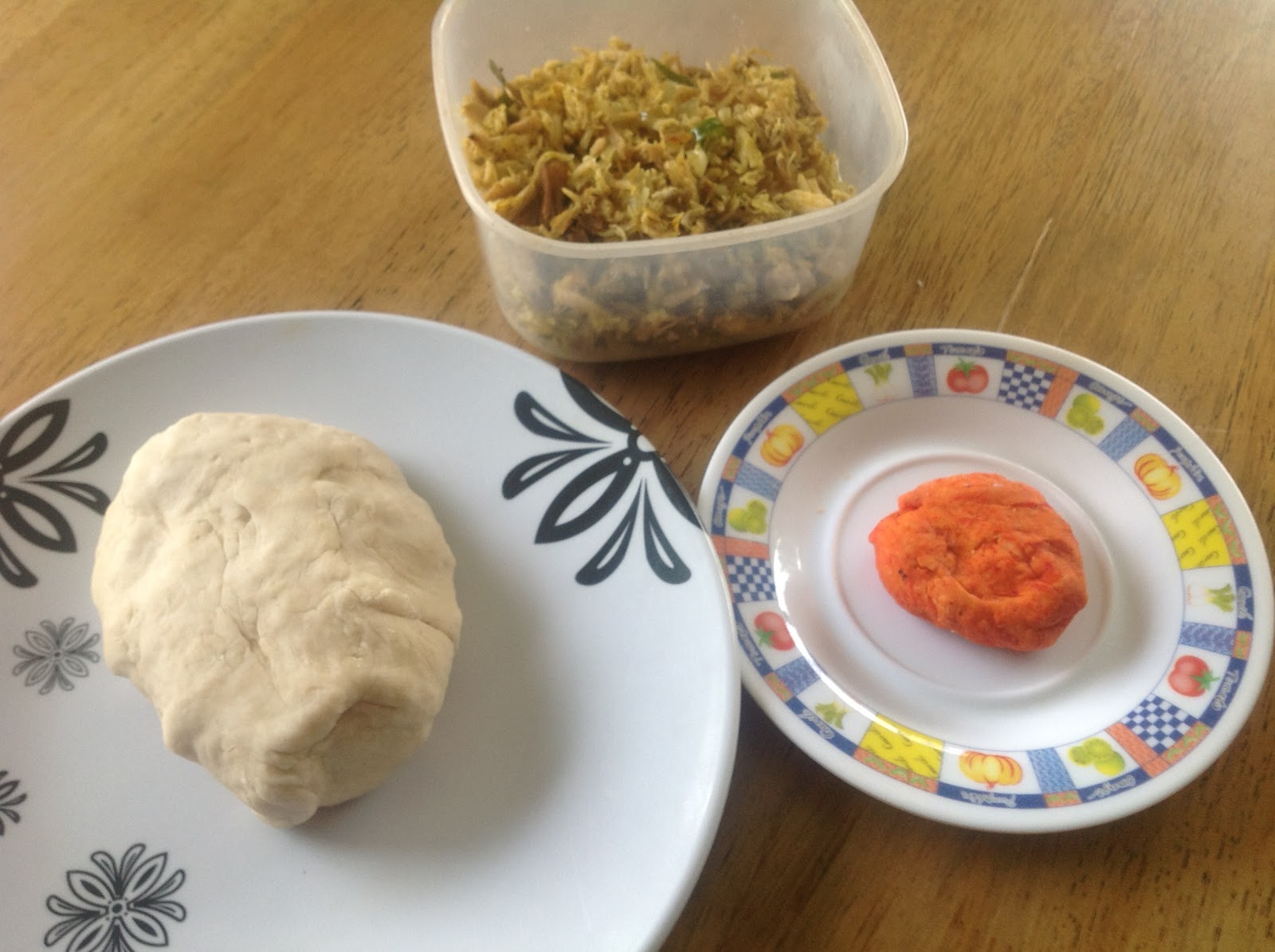- In a bowl, take a small quantity of plain flour, just enough to make a puri. Add a pinch of red colour , knead it and make a puri out of it. Cut into thin ribbons and keep it aside.