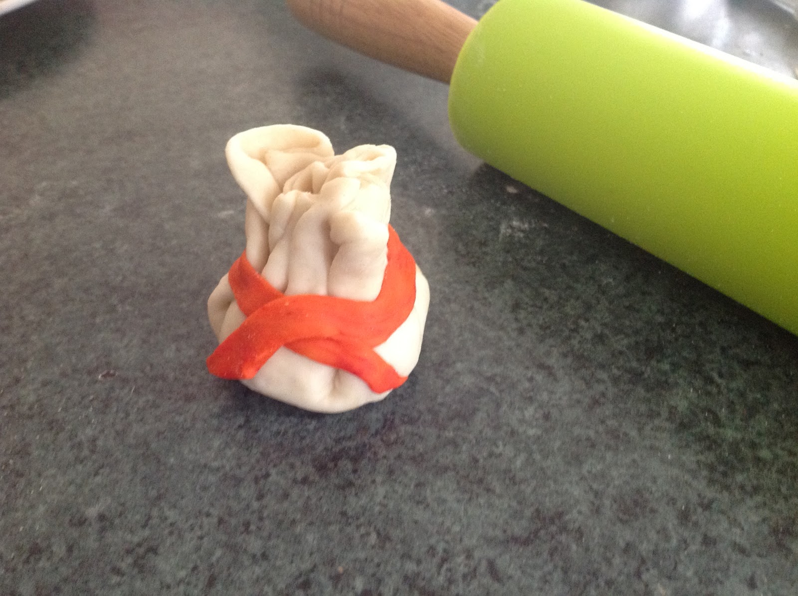 8. Roll the piece of ribbon around the pouch as shown in below..