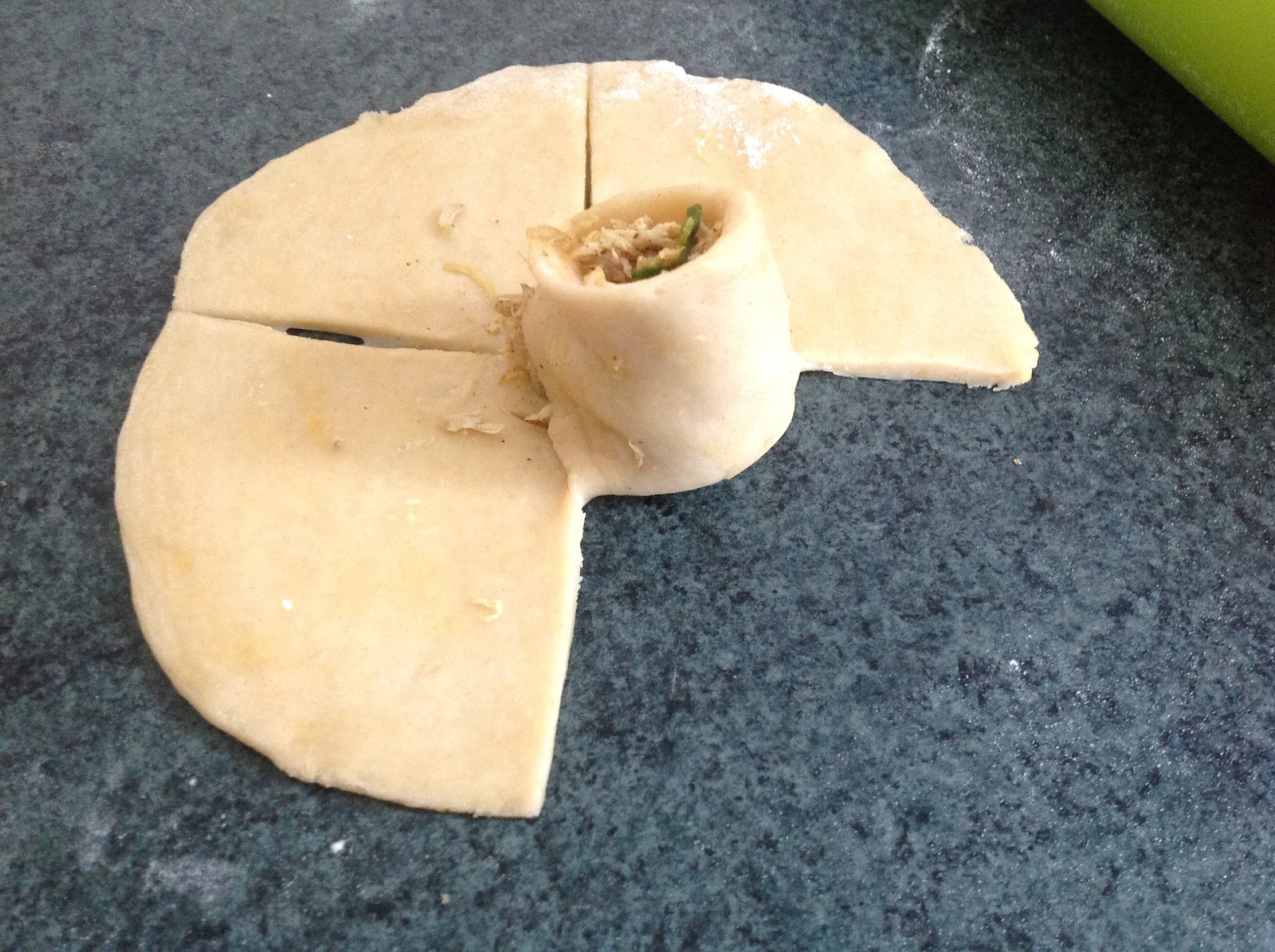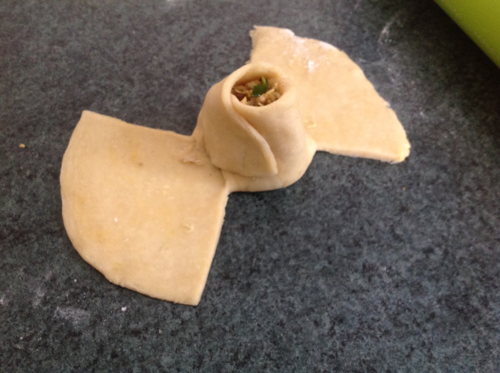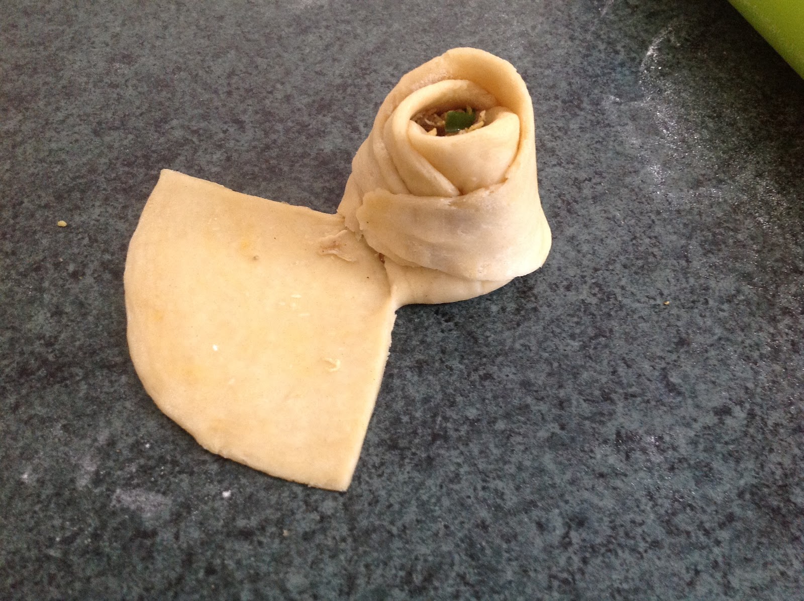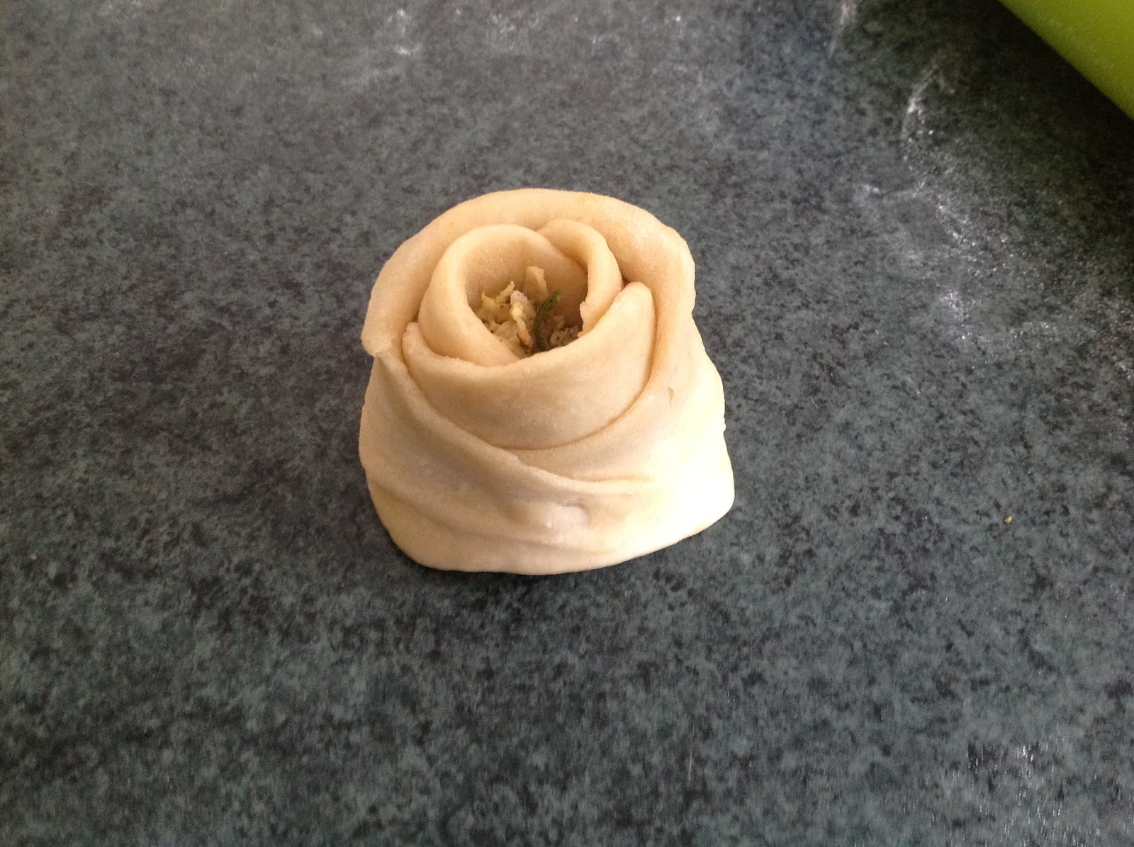 9. Bring the third portion around the previous layer and the last portion around. Pinch the dough on the sides to seal it.